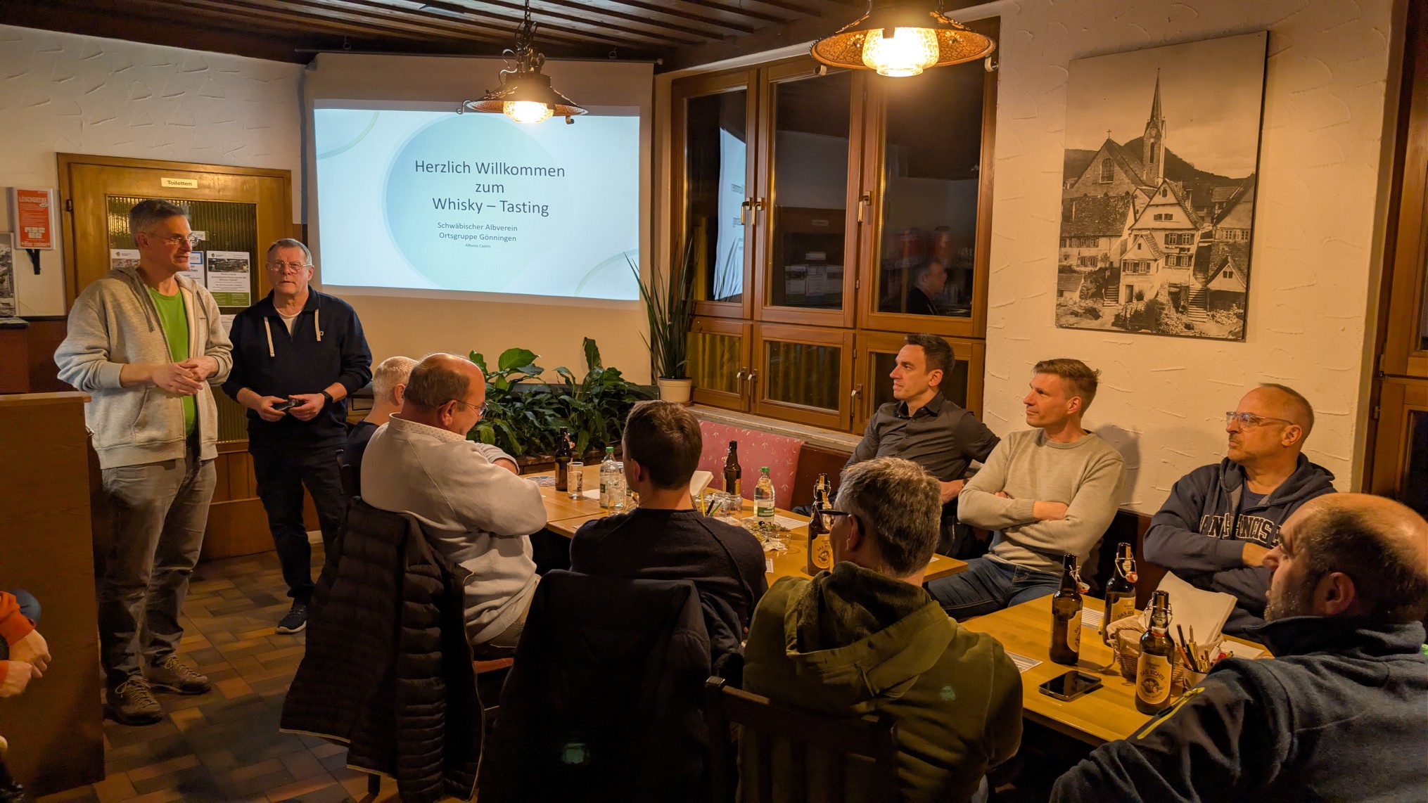 Koffer packen war nicht nötig, Gläser schon eher. Jochen begrüßte als Vorstandssprecher der Ortsgruppe Gönningen über 30 neugierige Whisky-Interessierte zu einer genussvollen Reise durch die europäische Whisky‑Vielfalt.