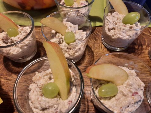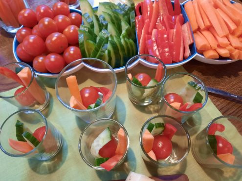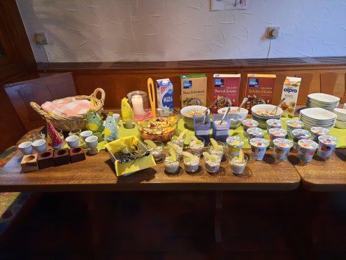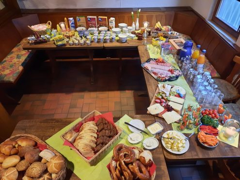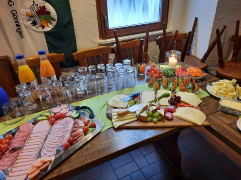 Frühstücksbuffet aufgebaut, das für jeden Geschmack etwas dabei hatte: Verschiedene Brötchen, Brezeln, Käse und Wurst, Joghurt, Müsli, selbstgemachtes Birchermüsli, Obstsalat, Gemüse im Gläschen, Gsälz, Imkerhonig, frisch gebackener Hefezopf, Rotweinkuchen und vieles mehr sorgte für kulinarischen Genuß.