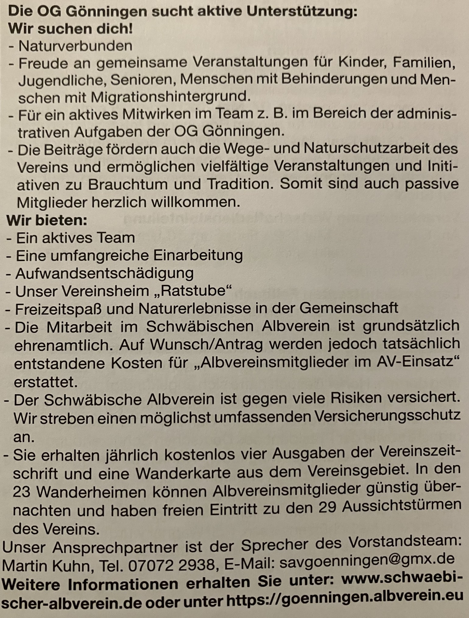 Wir wollen weiterhin handlungsfähig bleiben und eine Auflösung der OG Gönningen verhindern !!! Hierzu werden alle Mitglieder im Januar noch schriftlich informiert, siehe unten. Deshalb suchen wir weiterhin dringend aktiv Mitwirkende im Vorstandsteam um unsere ehrenamtliche Angebote ab 17. März … Weiterlesen