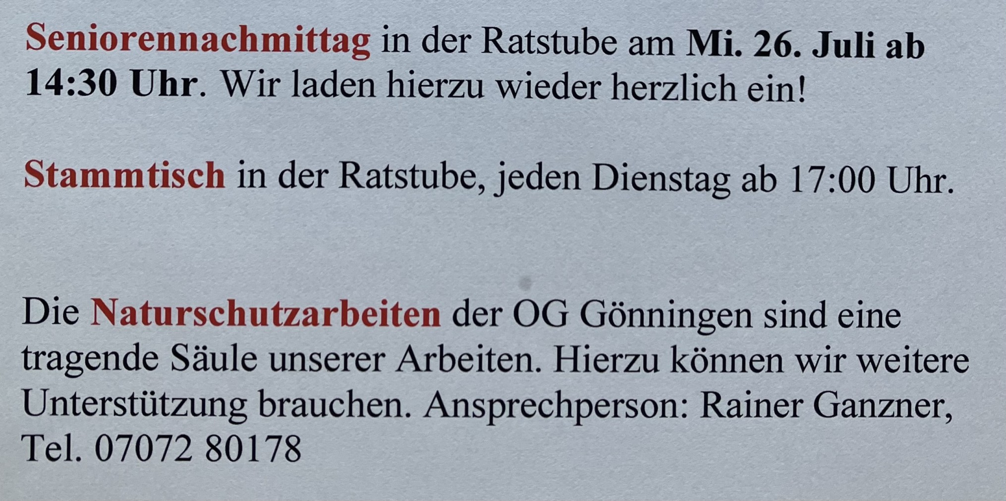 Fam.Wanderung 16.07., Seniorennachmittag, Stammtisch, Naturschutz